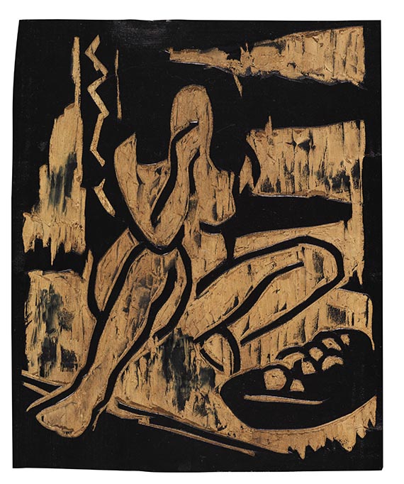 Doppelseitiger Holzstock: Liegendes Mädchen. Akt mit Obstschale