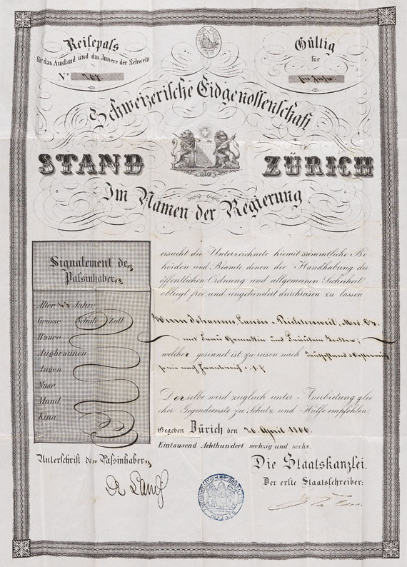 Reisepass Stand Zürich. 1866.